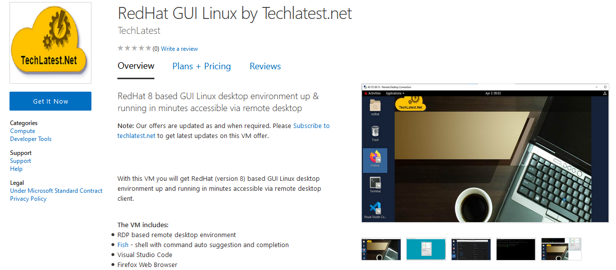 - Open RedHat GUI Linux VM listing on Azure Marketplace